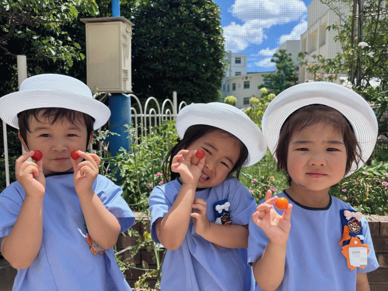 「もう赤くなったかな?」と子ども達は、毎日トマトの観察をし収穫を楽しみにしていました♪