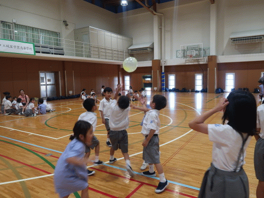小学生のお兄さん、お姉さん、幼稚園児がミックスされたチームに分かれて、ジェスチャーゲームと風船バレーを行いました。