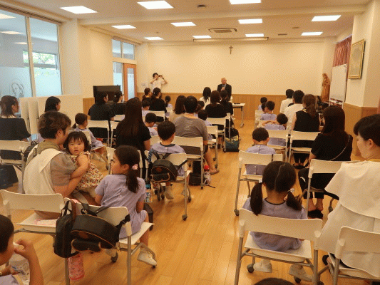 お昼ごはんの後、マルゲリータルームに移動した幼稚園の子どもたち。保護者と一緒に、永尾神父様からのお話を聞きました。