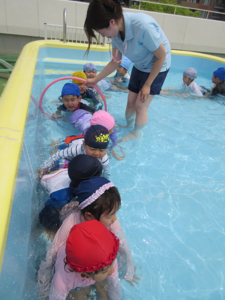 プールでは、顔付けや水のかけあいっこ、バタ足などを行いました☆