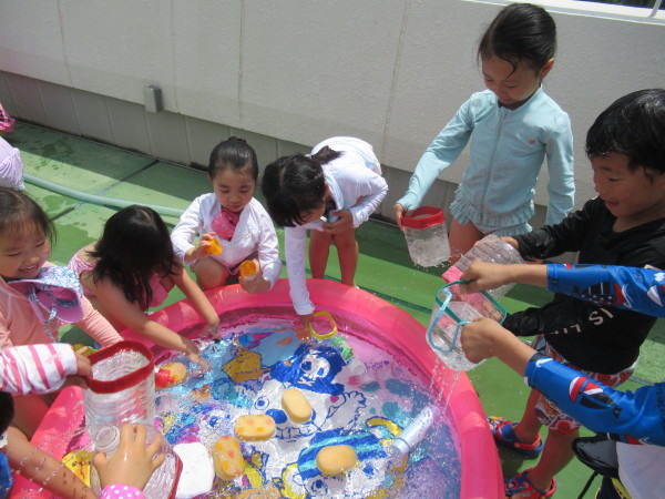 ビニールプールでは、ジョウロを使って水の掛け合いっこをしたり、ボールすくいをしたりと楽しそうな姿が見られました!