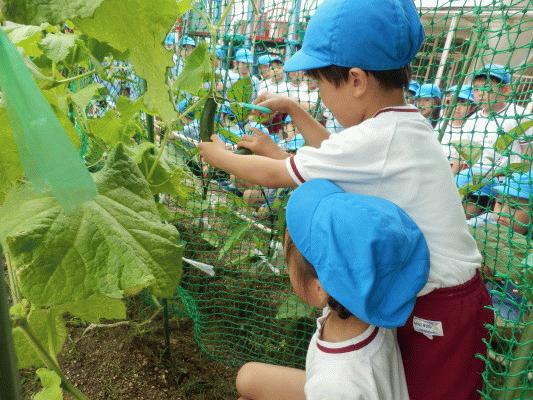 年長組で育てた「きゅうり」が大きく育ったので、子どもたちと一緒に収穫し、給食でいただきました!