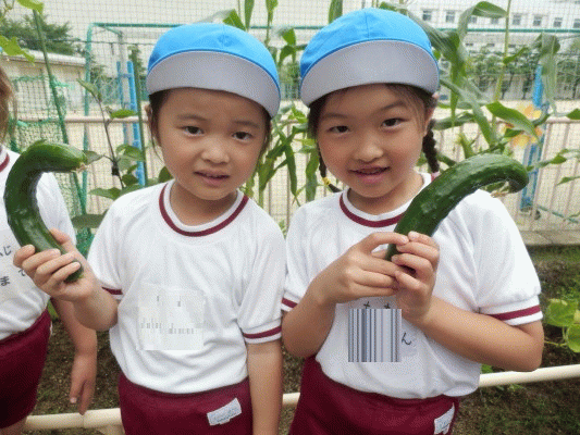 大きくなったきゅうりをみて、子ども達も「こんなに大きくなるんだ!」「なんだか曲がってる!」などと盛り上がっていました☆