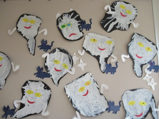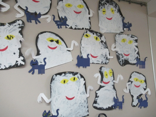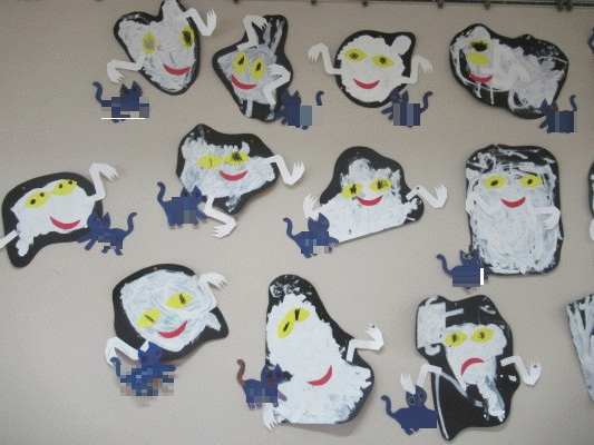 白い絵の具でおおきなおばけを描いて、目や口の形をした色画用紙をのりで貼って、手をつけると・・・おばけの完成!