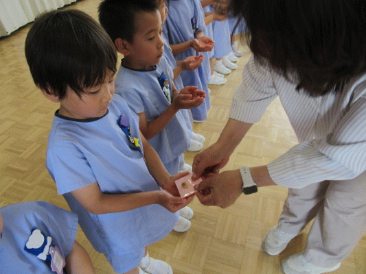 みんなから歌とお言葉のプレゼントをもらったあと、園長先生からおメダイのプレゼントをいただきました!(^^)!