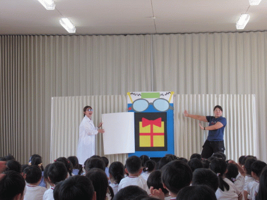 先生からのプレゼントでは、博士がつくったマシーン「ビックマンエックス」でキャンディーやクレヨン、プレゼントなど、、いろんなものを大きくして遊びました☆