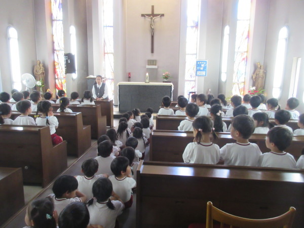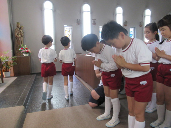 園長先生からは、今週末にある聖母祭に向けて、優しい心を持てる強い子どもになれるように…とお話がありました!!