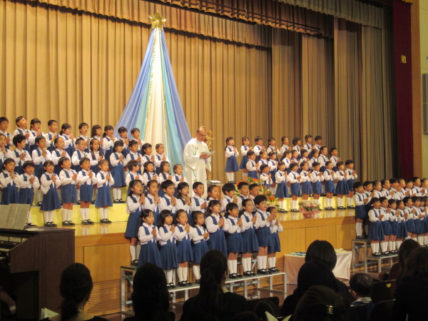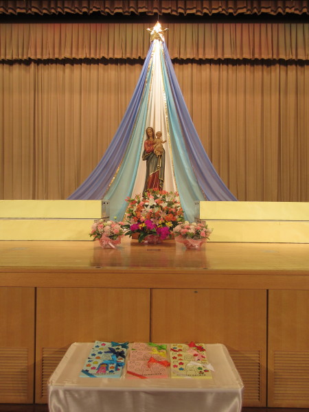 今日の日を迎えるために、子どもたち一人ひとりが自分の心の中に花を咲かせる「徳の花」に取り組んできました。子どもたちみんなが、いつでも優しい心で一日一日を大切に過ごす事が出来るように、中央ホールにもマリア様を飾り準備をしてきました。