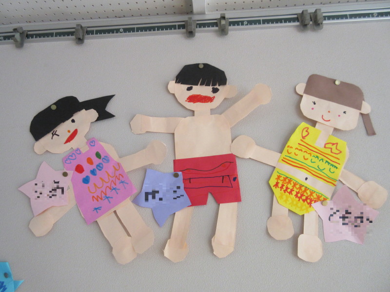年中組では、7月の壁面「水着姿のぼく・わたし」を作りました★☆