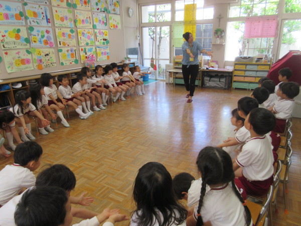 始めに、手遊び歌をしました。各クラスごとにお気に入りの歌があり、全部で8曲紹介し、その中から5曲、一緒に楽しみました!