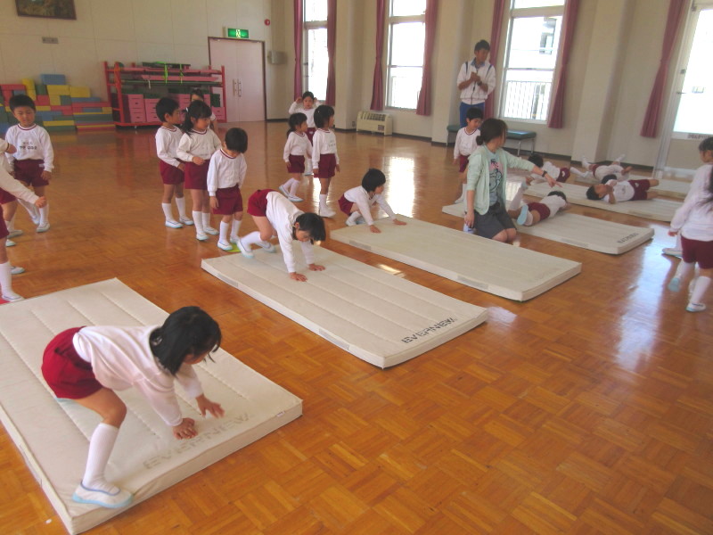 体操が終わったら、クマに変身してマットの上をお尻を高く上げ、手でマットを押しながら進みました。