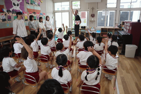 誰のお家の人かを英語で聞かれたときには、少し恥ずかしそうにしている様子が見られましたが、みんな元気よく手を挙げてたくさん発言していました(*^▽^*)/