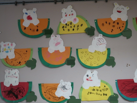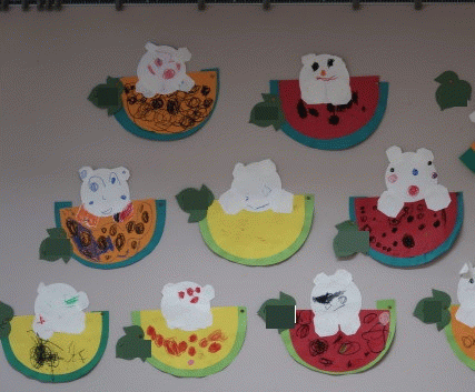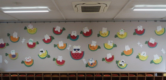 年少組の6月壁面は制作「しろくまとスイカ」です(^^)/