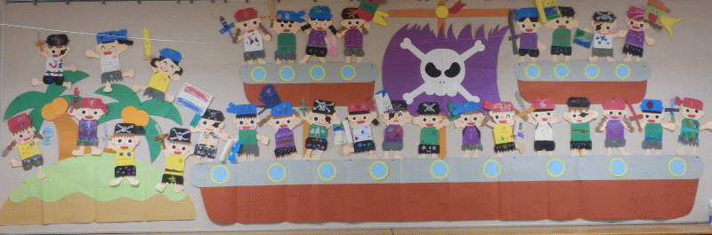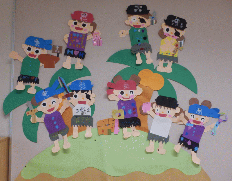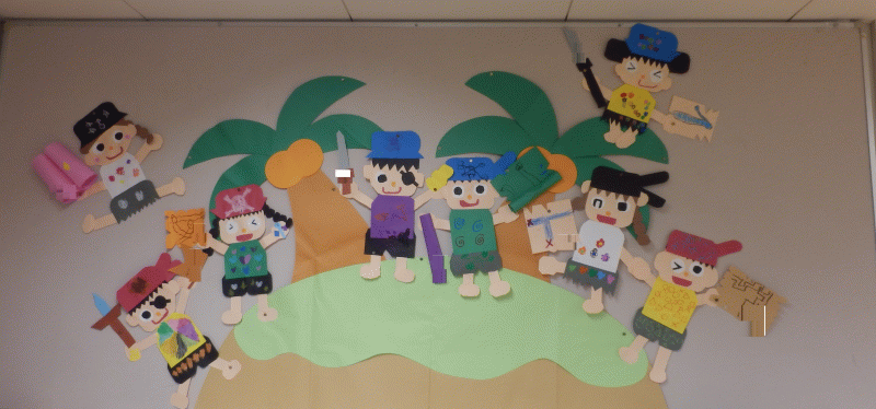 クラスカラーの旗のついた海賊船に乗っていたり、島でジャンプをしていたり、海賊に変身した一人ひとりの個性がとっても素敵な壁面になりました(^^♪