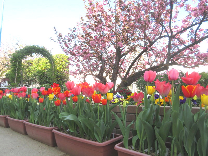 ピンクの門を通って、パンジーやチュウリップの花が咲く花壇の前で、