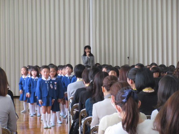 お家の人と一緒に講堂に集まると、今日の日をお祝いするために参加した年長組と一緒に、今日を迎えることが出来た嬉しい気持ちと、これから楽しく過ごせますように・・・と心をこめてお祈りをお捧げしました。