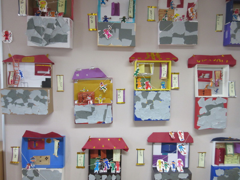 掛け軸やタンス、障子に隠れていたり、水の中に隠れている「水遁の術」の様子を表したり、子どもたちのアイデアあふれる作品となりました(^_-)-☆