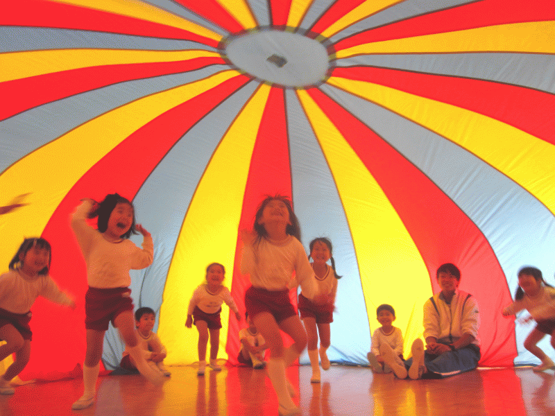 上下に動かして波を作ったり、みんなで力を合わせてテントを作り、中でジャンプをして遊びました!