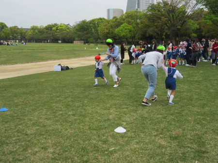 お家の人は青りんご、子ども達は赤りんごの繋がった帽子を被って、落とさないようにリレーをしました♪