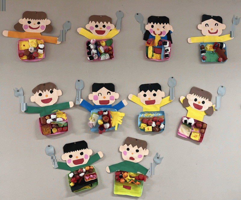 「どんなおかずにしようかな?」「おにぎり3ついれちゃおっと!」などと、いつもおうちの人が作ってくれるお弁当を思い出しながら、画用紙や花紙を使って、楽しく取り組む姿がみられました☆