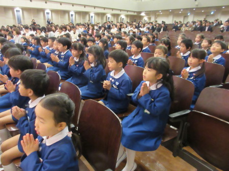 講堂に、来賓の方や幼稚園の代表として参加している年長組。