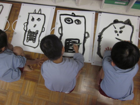はじめに色々なオニの顔を見ながら、先生と一緒にどんな顔にしようか相談しながら説明を聞きました(^^)