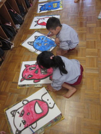 「こわいおににしよ〜」「ねむそうな かおにしよ〜」と楽しそうにしていました(^^)