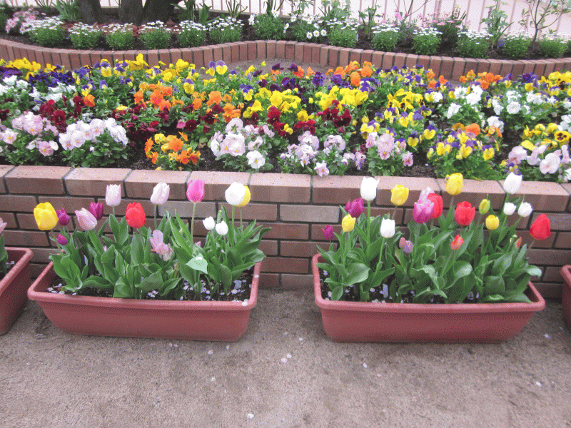 花壇も新しく改築されて、その前に並んだチューリップが色とりどりに咲いていて、とっても賑やかです(*^_^*)