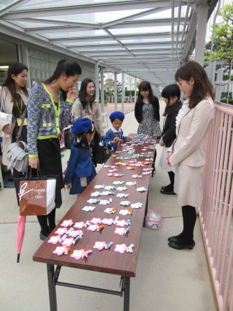 受付の机に並んだ名札の中から、自分の名前を見つけて嬉しそうな子どもたち。