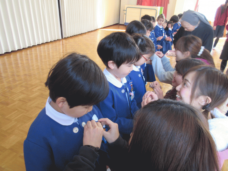 司教館のホールで、司祭様に各クラスの代表の子ども達が、