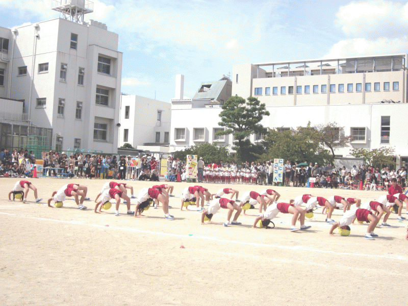 組立体操では、すべり台・片手バランス・ブリッジ・ヒマワリと