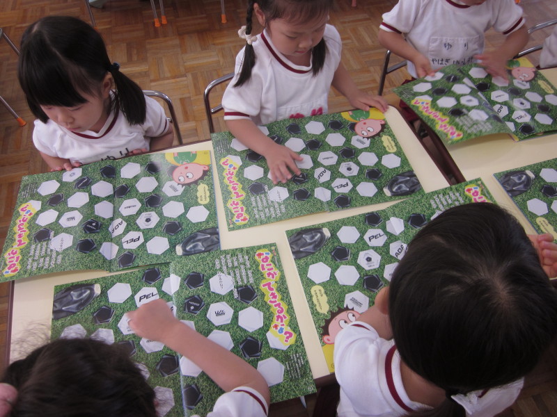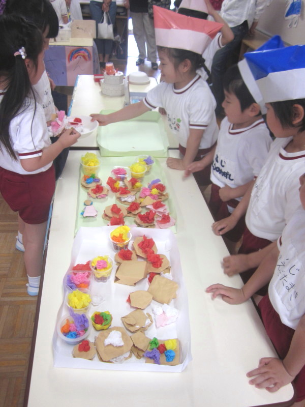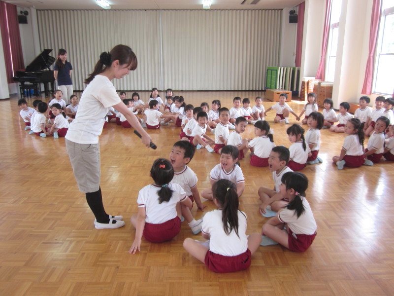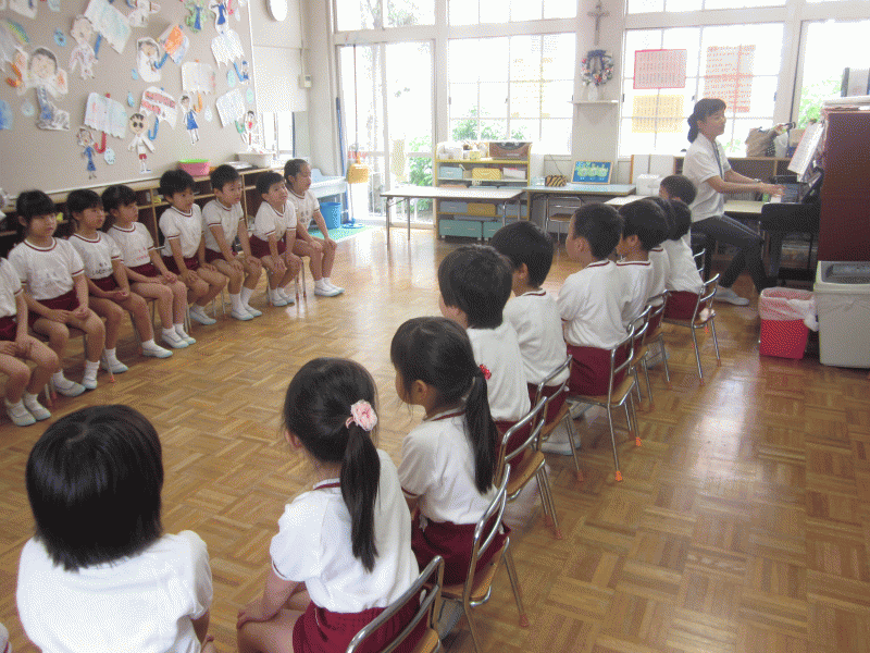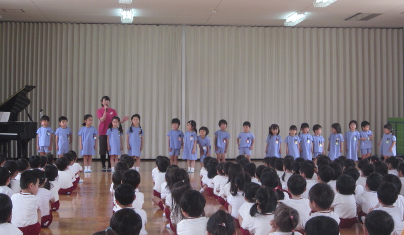 全 2086 件(全418ページ) 過去のページもご覧いただけます ⇒ 前へ 266 | 267 | 268 | 269 | 270 | 次へ 2014/6/12 ☆プール開き☆ 今日は、お天気は曇っていましたが、年長組・年中組・年少組が集まり、プール開きを行いました♪ これから、年長組・年中組はプール遊び、年少組は水遊びが始まります。みんなで聖歌「あの空はどうして青い」を歌い、お祈りをお捧げしました。 これから、年長組・年中組はプール遊び、年少組は水遊びが始まります。みんなで聖歌「あの空はどうして青い」を歌い、お祈りをお捧げしました。 神様に祝福して頂いたお恵みの水を、プール遊び、水遊びをする子ども達が危ないことから守られ、楽しく遊ぶことが出来ますように…と園長先生がプールに注いでくださいました。その様子を聖歌「うみでおよぐ」を歌いながら、みんなを守ってくれるよう心を込めてお祈りをしました。今年も神様に見守って頂きながら、楽しく安全に、プール遊び・水遊びをしたいと思います!(^^)! 神様に祝福して頂いたお恵みの水を、プール遊び、水遊びをする子ども達が危ないことから守られ、楽しく遊ぶことが出来ますように…と園長先生がプールに注いでくださいました。その様子を聖歌「うみでおよぐ」を歌いながら、みんなを守ってくれるよう心を込めてお祈りをしました。今年も神様に見守って頂きながら、楽しく安全に、プール遊び・水遊びをしたいと思います!(^^)! ☆プール開き☆ 2014/6/12 今日は、お天気は曇っていましたが、年長組・年中組・年少組が集まり、プール開きを行いました♪ これから、年長組・年中組はプール遊び、年少組は水遊びが始まります。みんなで聖歌「あの空はどうして青い」を歌い、お祈りをお捧げしました。 これから、年長組・年中組はプール遊び、年少組は水遊びが始まります。みんなで聖歌「あの空はどうして青い」を歌い、お祈りをお捧げしました。 神様に祝福して頂いたお恵みの水を、プール遊び、水遊びをする子ども達が危ないことから守られ、楽しく遊ぶことが出来ますように…と園長先生がプールに注いでくださいました。その様子を聖歌「うみでおよぐ」を歌いながら、みんなを守ってくれるよう心を込めてお祈りをしました。今年も神様に見守って頂きながら、楽しく安全に、プール遊び・水遊びをしたいと思います!(^^)! 神様に祝福して頂いたお恵みの水を、プール遊び、水遊びをする子ども達が危ないことから守られ、楽しく遊ぶことが出来ますように…と園長先生がプールに注いでくださいました。その様子を聖歌「うみでおよぐ」を歌いながら、みんなを守ってくれるよう心を込めてお祈りをしました。今年も神様に見守って頂きながら、楽しく安全に、プール遊び・水遊びをしたいと思います!(^^)! 2014/6/11 ☆6月 お誕生日会☆ 今日は、6月のお誕生日会です(^v^)雨のお恵みや、キラキラ太陽のお恵みでぐんぐん野菜が育つ、エネルギーいっぱいの6月に生まれたお友達が集まりました(*^_^*) お友達に名前を紹介してもらい、お歌のプレゼントもしてもらって、ニコニコの子どもたち!! お友達に名前を紹介してもらい、お歌のプレゼントもしてもらって、ニコニコの子どもたち!! 園長先生から、キラキラのおメダイを頂きました。おメダイを覗き込み、にっこり笑顔の子どもたちでした(^_^)vこれからも、神様の光の子どもとして素敵なおにいさん、おねえさんになってね!! 園長先生から、キラキラのおメダイを頂きました。おメダイを覗き込み、にっこり笑顔の子どもたちでした(^_^)vこれからも、神様の光の子どもとして素敵なおにいさん、おねえさんになってね!! 先生達からのプレゼントは、子どもたちの大好きな『ばけばけばけばけ ばけたくん』です。どこからともなく、“フワフワ〜”と、とんできたばけたくんは、おいしい食べ物をみつけると… パクパクパク〜 先生達からのプレゼントは、子どもたちの大好きな『ばけばけばけばけ ばけたくん』です。どこからともなく、“フワフワ〜”と、とんできたばけたくんは、おいしい食べ物をみつけると… パクパクパク〜 すると…あら、ふしぎ…なんと、食べた物にばけちゃいました!!いろんな食べ物にばけるばけたくんを、楽しみながら見て、大笑いしていた子どもたちでした(*^_^*) すると…あら、ふしぎ…なんと、食べた物にばけちゃいました!!いろんな食べ物にばけるばけたくんを、楽しみながら見て、大笑いしていた子どもたちでした(*^_^*) ☆6月 お誕生日会☆ 2014/6/11 今日は、6月のお誕生日会です(^v^)雨のお恵みや、キラキラ太陽のお恵みでぐんぐん野菜が育つ、エネルギーいっぱいの6月に生まれたお友達が集まりました(*^_^*) お友達に名前を紹介してもらい、お歌のプレゼントもしてもらって、ニコニコの子どもたち!! お友達に名前を紹介してもらい、お歌のプレゼントもしてもらって、ニコニコの子どもたち!! 園長先生から、キラキラのおメダイを頂きました。おメダイを覗き込み、にっこり笑顔の