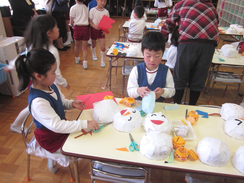 お話を聞いて、みんなでオニの帽子を作りました(^^)