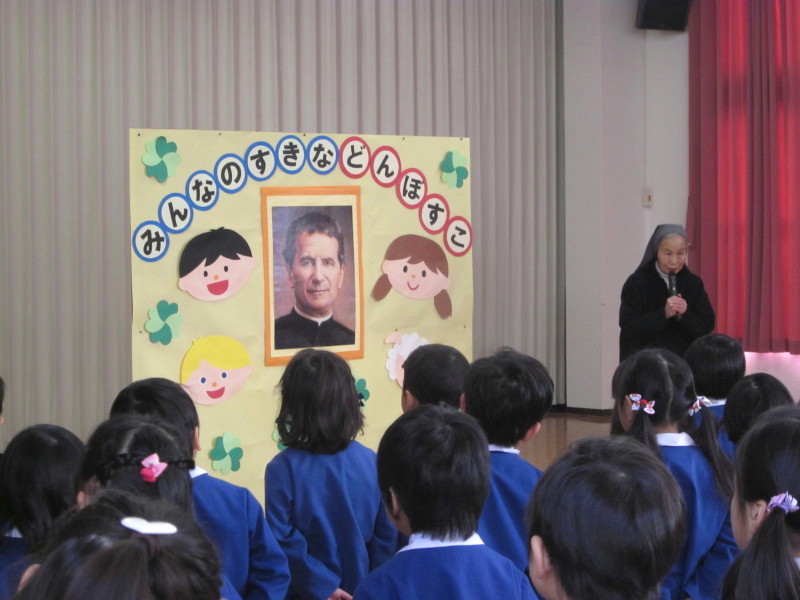 今日は、学園の創設者であるドンボスコのお祝い会をしました。