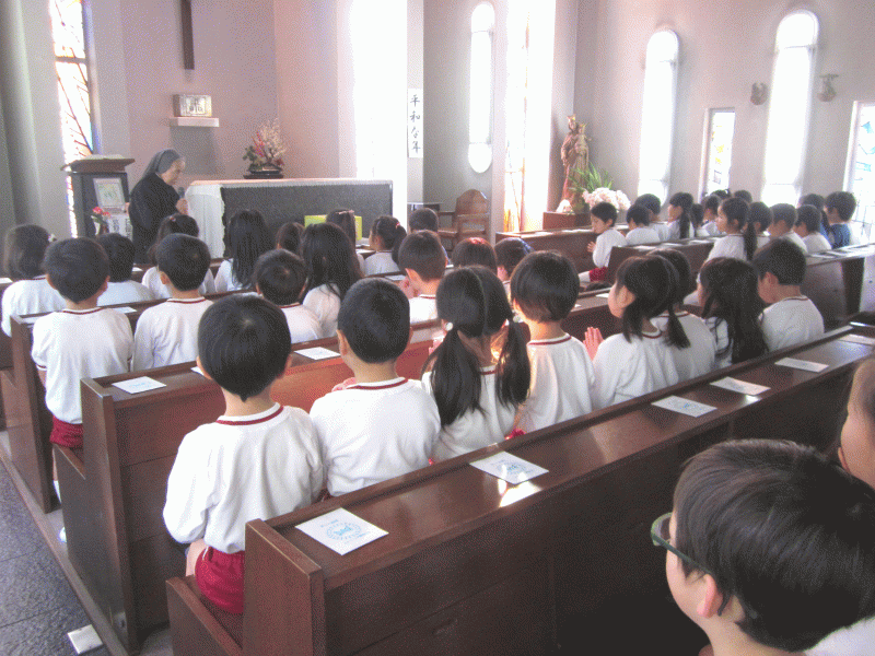 新たな気持ちで、聖堂に集まった年長組の子どもたち。