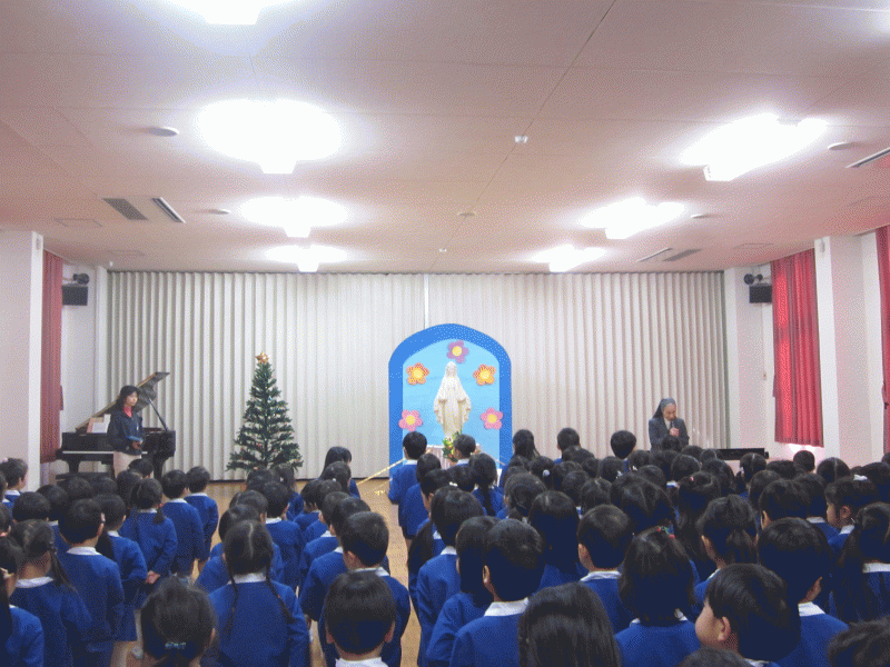 お友だちのことや、家族のこと、そして、世界中の人たちのことを思い、みんなで「マリア様に近づけるように、お導きください」と心を一つにして、お祈りをお捧げしました。