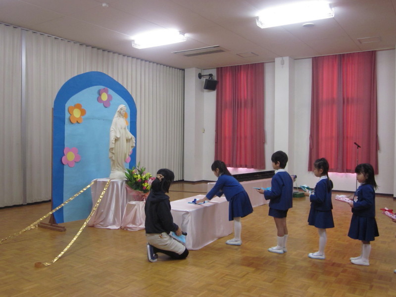 今日の日を迎えるために、心のきれいなマリア様にならって、子どもたちは毎日の生活の中でできる「小さな善い行い」(徳の花)を行ってきました。