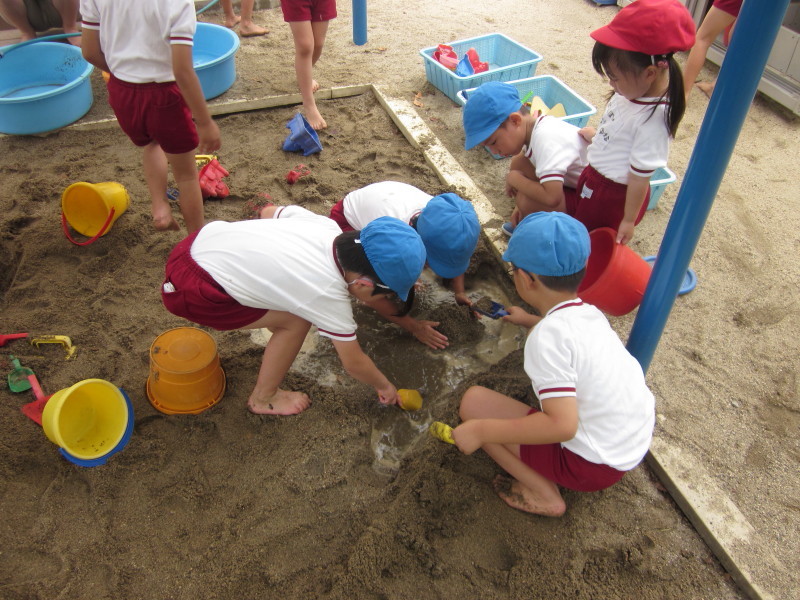 早速、砂場で大胆に遊び始めたのは、年長組さんです!