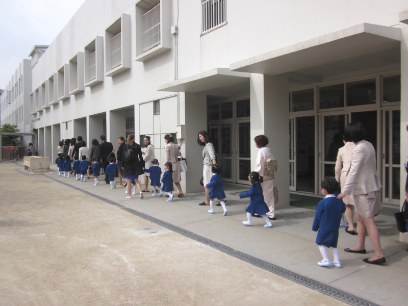 遊戯室での始業式を終えて、クラスの先生と一緒にお部屋にもどっていきました。