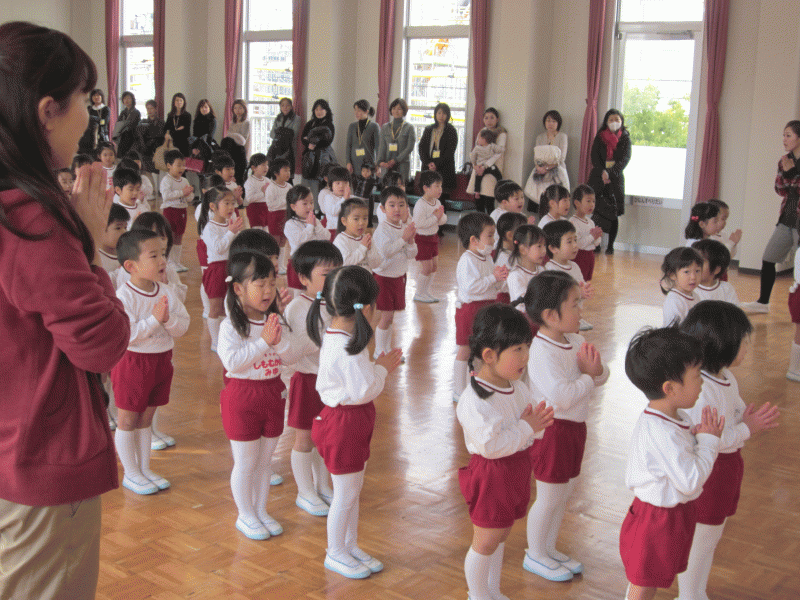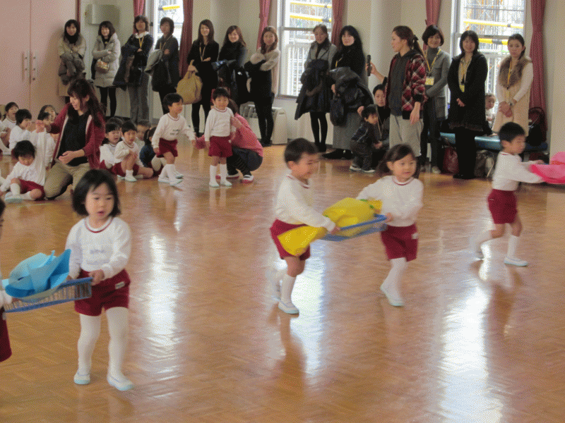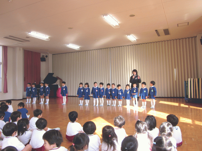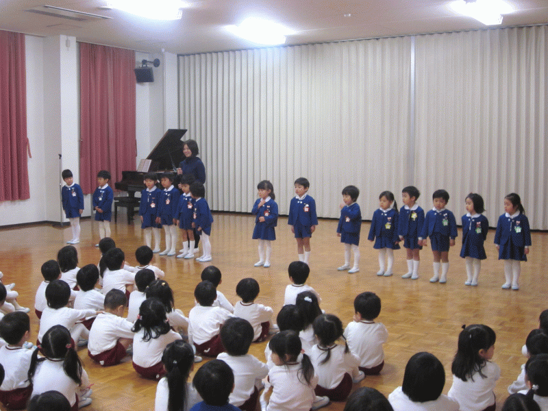 遊戯室に全園児が集まって、お祝い会の始まりです!