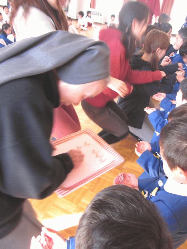 お話の中で子どもたちが、「2人のうち、どっちが好き?」とドンボスコに尋ねると、ドン・ボスコは、自分の指に例えて「どちらの指も大切なように、2人とも同じように大切なんだよ」と優しく教えてくださいました!!