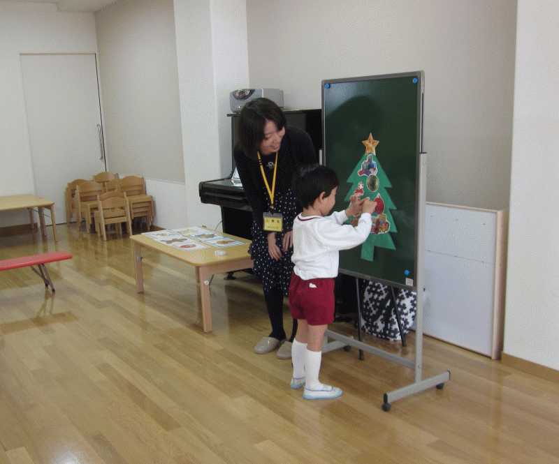ツリーに、オーナメントやプレゼント、スターを飾り付けました。
