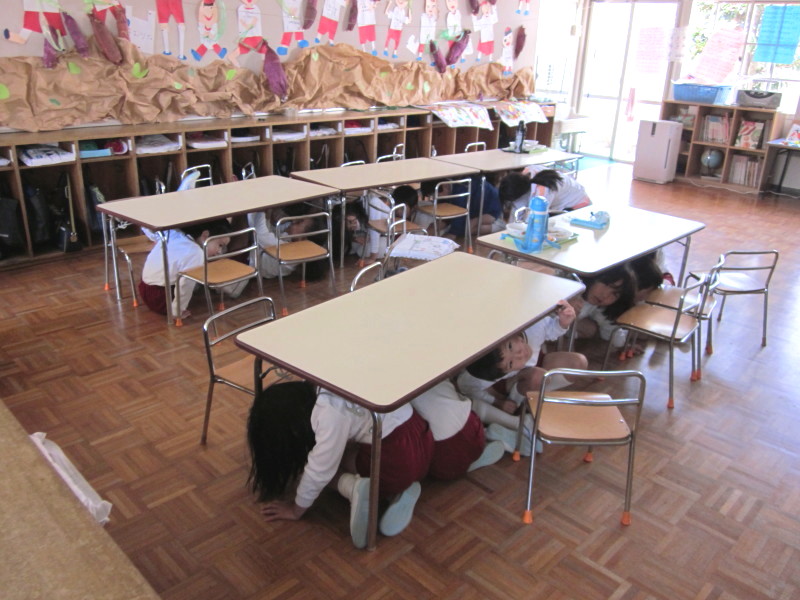 鳴り終わったら、すぐに机の下にもぐって身体を守ります。