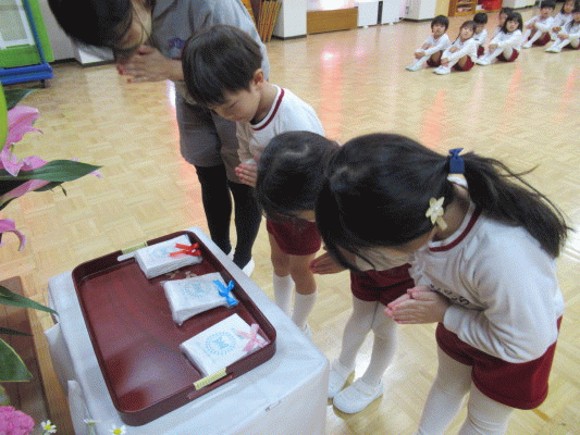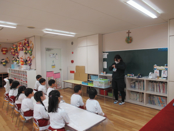 シスターからは、100匹の羊のお話をしてくださり「誰か一匹でもいなかったらダメなんだよ。」という話をしてくださり、「幼稚園でも、同じでクラス全員が揃っていなかったら悲しいよね、、先生の話をしっかり聞いて、取り組んでほしい。」とお話をいただきました☆