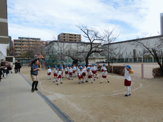 朝の自由遊びの時間、子どもたちが遊んでいるときにサイレンを鳴らし、放送を聞いてグラウンドに避難しました。