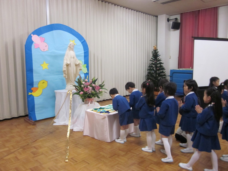 無原罪のマリア様のお祝いをした子どもたちは、お部屋に戻る前に、もう一度マリア様に手を合わせました。