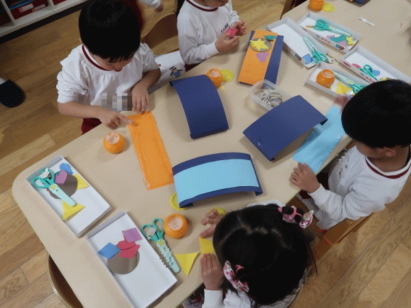 筒の形に紙を丸めたり、一枚の紙から耳や手、三角を作ったり…とても上手に制作していました(^−^)