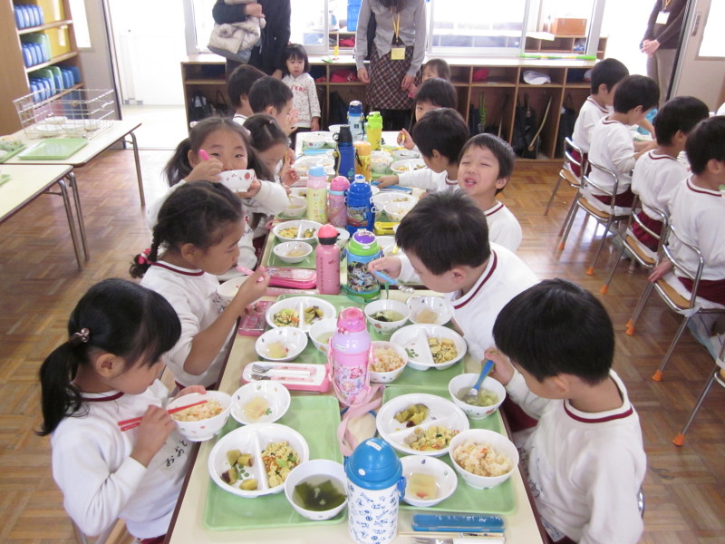 保護者の方々に配膳の様子や、おいしく頂いている様子を