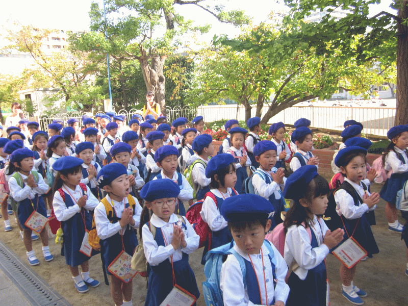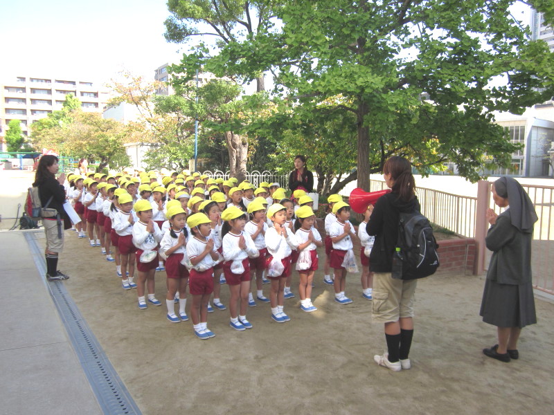 園庭に集まってお祈りをし、園長先生からお話を頂きました。