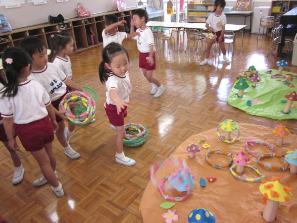 たくさんの輪をかごに入れてもらって、きのこの近くにいって
